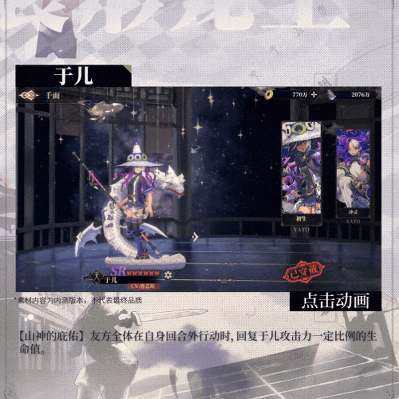 山神的庇佑:友方全体在自身回合外行动时,回复于儿攻击力一定比例的生命值。