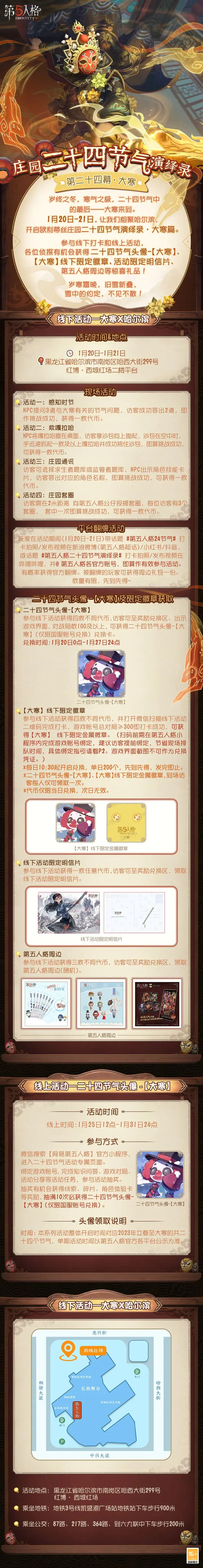 参与现场活动,各位访客有机会获得二十四节气头像-【大寒】兑换卡、【大寒】线下限量徽章、线下活动限定明信片、第五人格周边等丰富奖励~