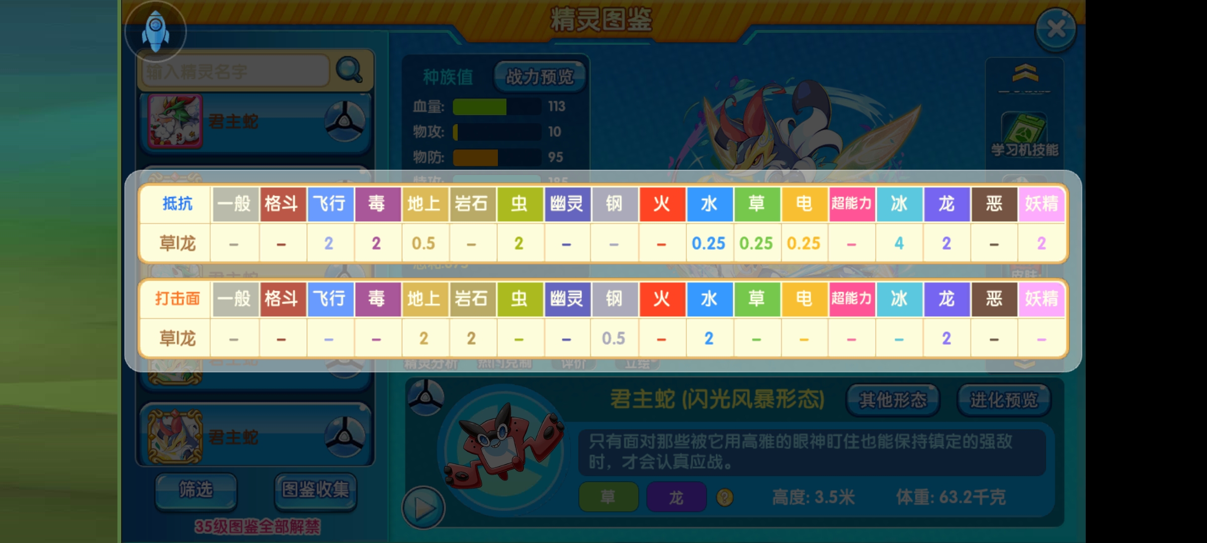 抵抗:电、水、草、地,弱点:毒、冰、飞行、龙等都是当前比较热门的属性,但是最大的敌人还是飞冰龙三属性,只要处理好这三种,君主蛇还是相当的暴力。