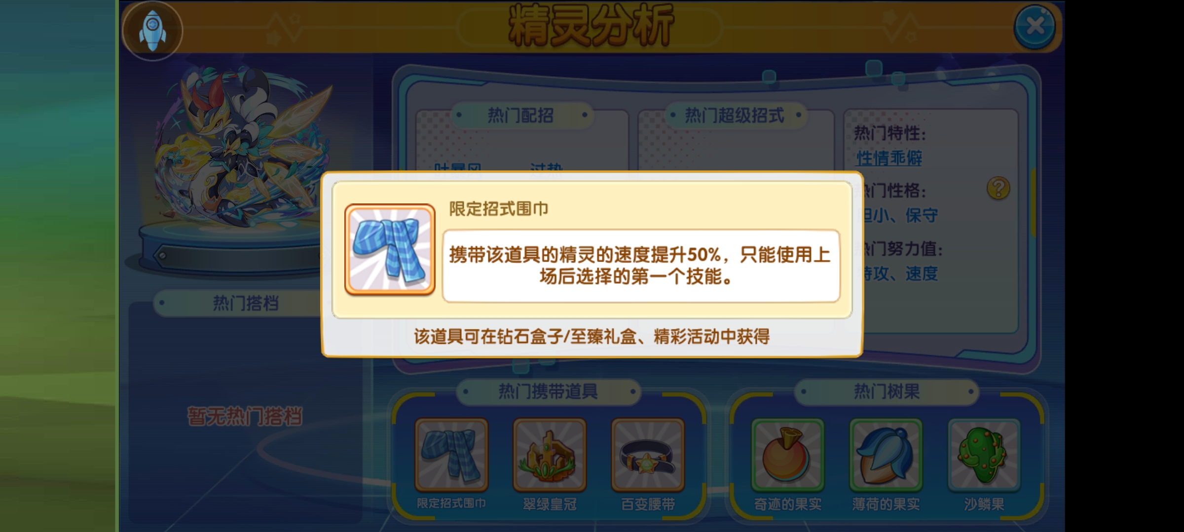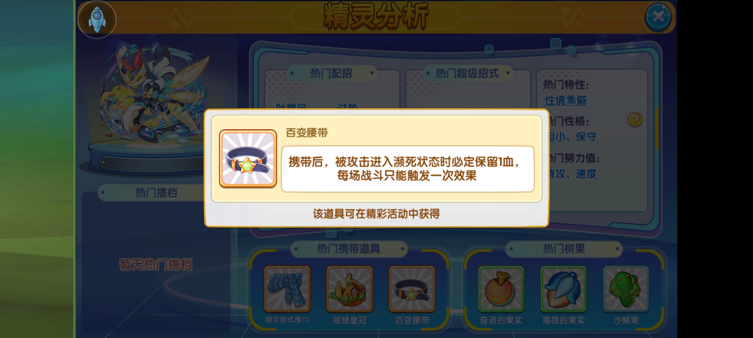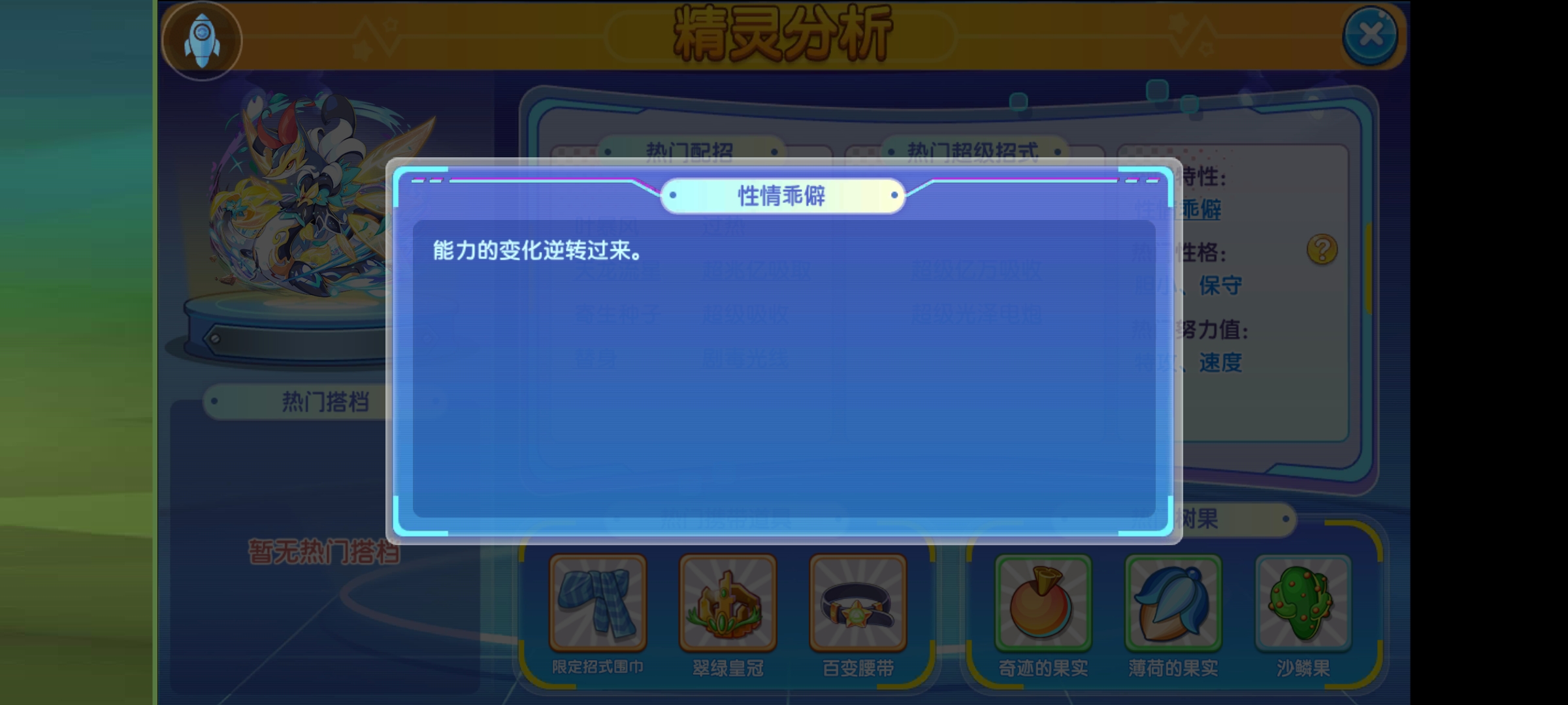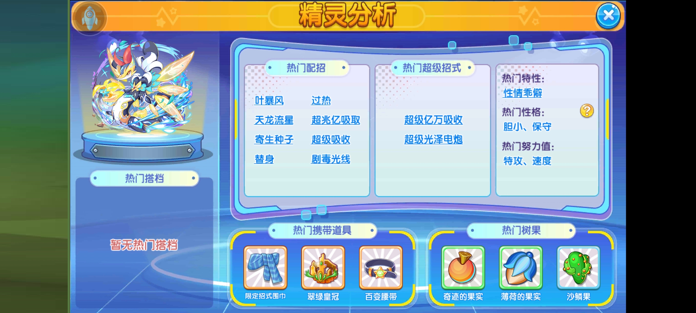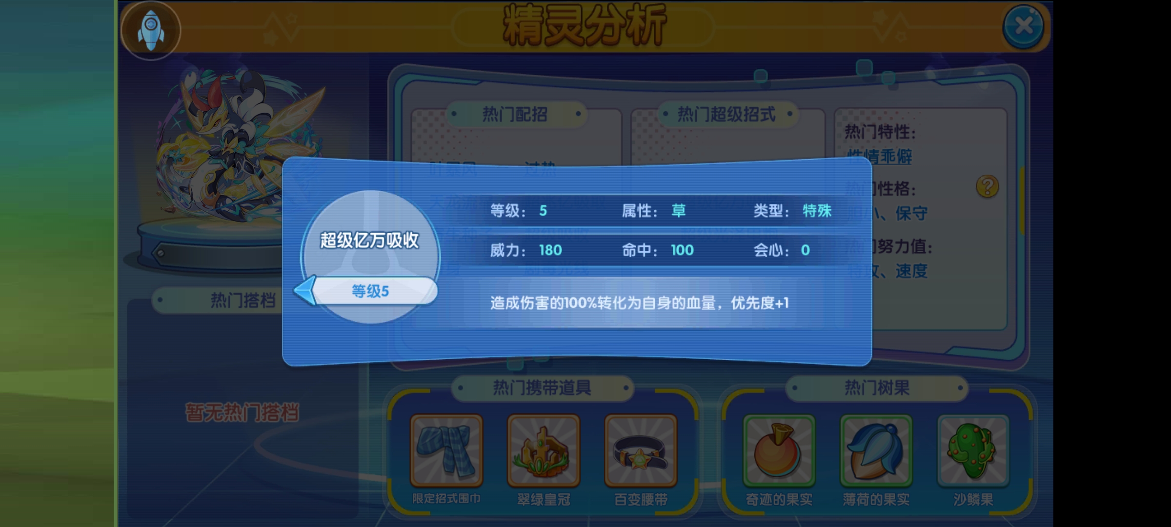 性格推荐:胆小,也是唯一,有人问为什么保守不行,保守速度快不过很多二线宠有时候强化起来打不出伤害就死了,所以这边只推荐胆小,谁用谁知道,道具推荐:翠绿皇冠/限定围巾/命玉/,皇冠可以增加打击面打飞行系两倍,还可减伤,限定围巾主要用于收割游击,出其不意。命玉能打出高额伤害,配合龙哥收割。大招推荐:超级亿万吸收