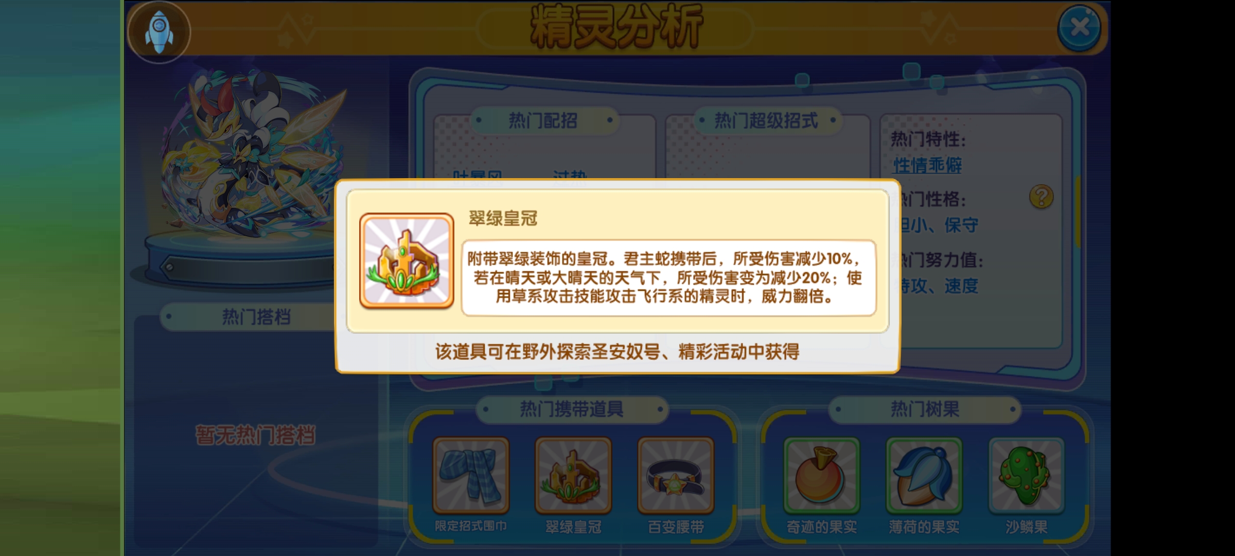 【翠绿皇冠】:君主蛇携带后,使用草系攻击技能攻击飞行系的精灵时,威力翻倍,所受伤害减少10%,若在晴天或大晴天的天气下,所受伤害变为减少20%,该道具需要各位留意各种大型兑换活动,属于不可多得的白嫖道具,基本只需要五千到一万的钻石即可获得,携带此道具主要也是用来针对飞行系和减伤,有时候还可以丝血反杀。