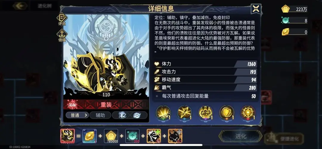 重装,超进化大陆双壁的另外一壁,近乎完美的前排减伤,降低攻击以及出色的镇守增益,搭配天元·圣盾埃癸斯堪称铜墙铁壁,目前还在up中,不管有没有天元·圣盾埃癸斯,都可以抽一个,这个真吃不了亏上不了当。