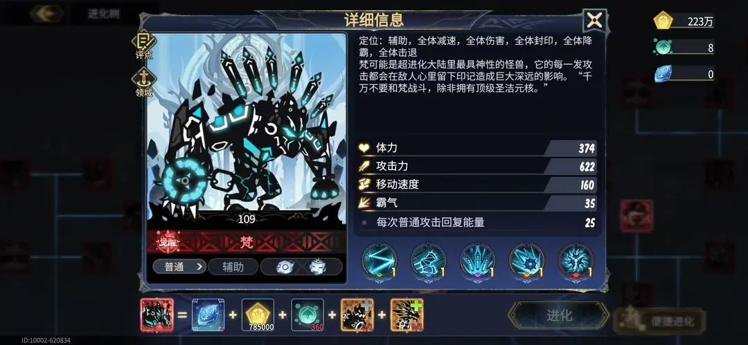 梵,目前能合成的最优秀的辅助之一,技能释放能给敌方上层层debuff,封印、减速、减霸气和受到伤害增加,都能很好的帮助天元·圣盾埃癸斯压墙角。