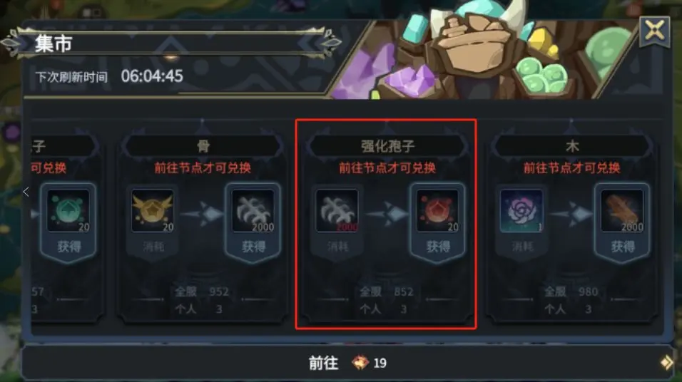 然后再去每天早晚九点刷新的集市里面,用绿孢子兑换红黄孢子(这个兑换是等量的!)乃至其他资源,完成其他的资源的置换。这个过程是需要日积月累的。