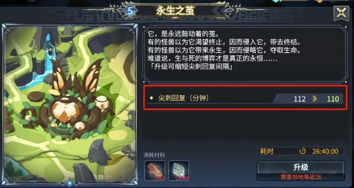 建筑物中,出产材料的三大建筑、起源基石(加战斗力非常明显)、黑暗之森、永生之茧等,都可以有效地加速我们获取资源的效率。需要尽快升到20级往上。