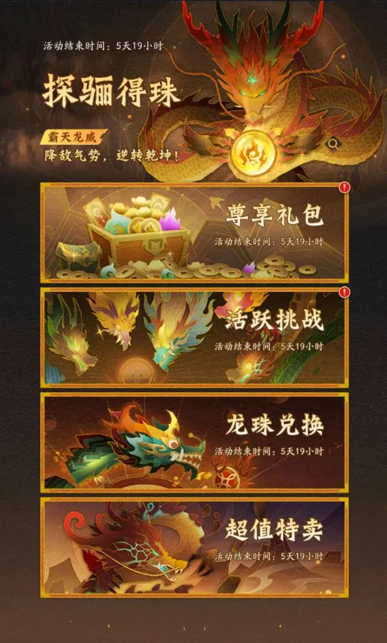开启条件:道友们进入第4章且开服11日后即可开启活动全新活动「探骊得珠」来袭!助力道友获取强力龙珠「霸天龙威」,活动期间,道友们可通过完成【活跃挑战】或购买【尊享礼包】进行龙珠兑换,更有【超值特卖】活动限时开启!具体活动内容如下: