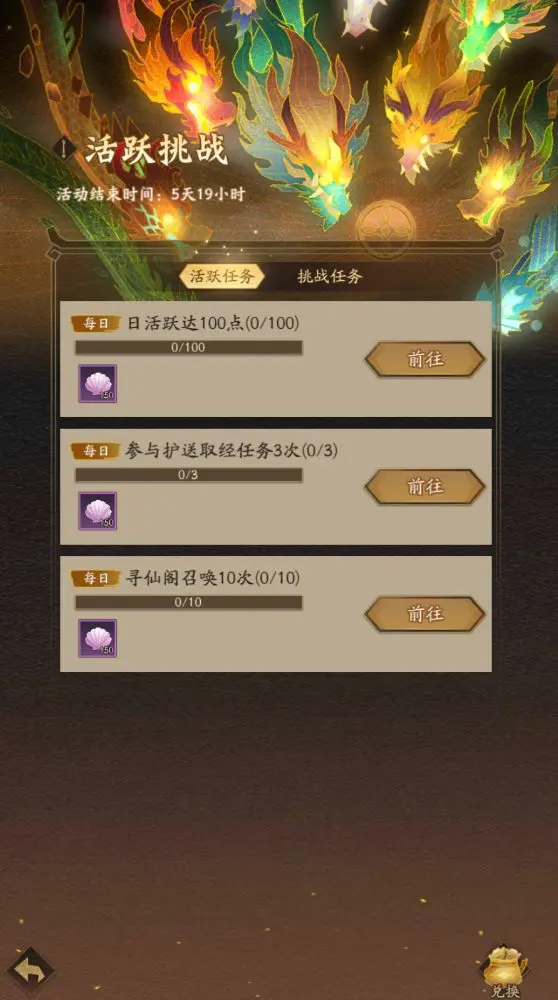 活动期间,活跃挑战活动分为【活跃任务】以及【挑战任务】。活跃任务将于每日7点进行刷新,挑战任务在活动期间仅限完成一次。通过完成任务即可获得「龙珠仙珍」,可在普通兑换中轻松兑换霸天龙威龙珠碎片、逆鳞、火龙珠、寻宝仪等海量奖励。