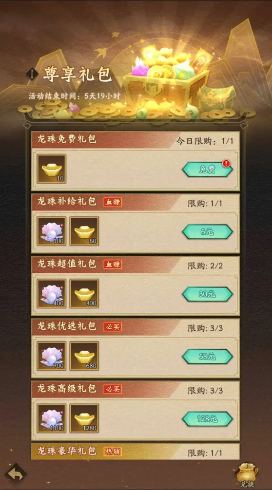 活动期间将上架系列礼包,含有「龙珠神贝」、逆鳞、火龙珠以及海量元宝等超值奖励,快来选购吧!