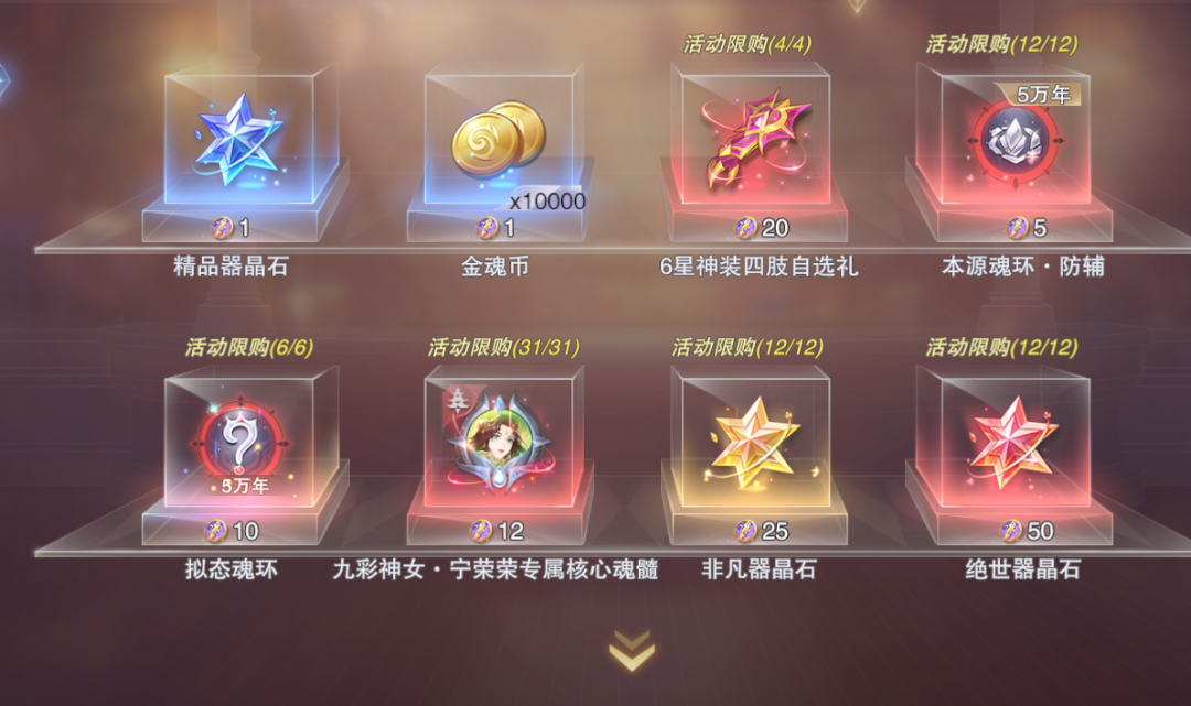 然后这个兑换商城真的就是按需兑换了,其中SP宁荣荣的核心专属魂髓、器源材料、6星神装、体力是优先级稍微较高的几个选项,大家可以大致参考一下。