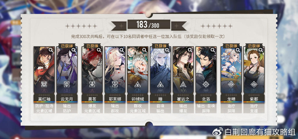 各位监督们好,这里是有猫攻略组,白荆四测终于是开服了,各位主线推得怎么样了,有没有开始下池子抽取心仪的角色了呢,说起抽卡,这次测试有个我最喜欢的改动,那便是新手的30抽必出6星角色换成了满30抽可自选一名6星,这样既不影响我们三十抽的保底累计,又不至于抽到不喜欢、用不上的角色。但面对这十位六星同调者,想必有不少新手监督们犯了难,技能介绍看不过来,不知如何选。本期攻略组就为各位萌新监督们粗略介绍一下几位六星同调者,帮助大家选择。