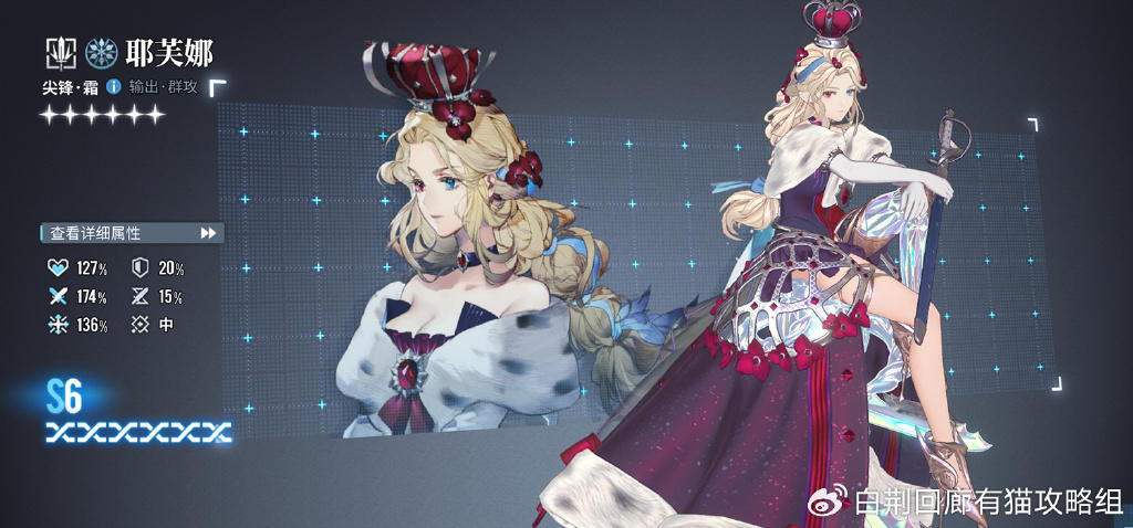 卡面顶级,拥有强大的破盾能力,队长技对霜队输出的提升很高,建议玩霜队时将耶芙娜作为队长使用。搭配水元素地形或在潮湿环境可以大范围控制,在三测时因为技能系数太低,没有输出而被人诟病,可以说除了没伤害啥都好。而四测终于是大幅增强了耶芙娜的输出能力,这下终于是能当主c用了,不管是搭配新增的霜属性五星打共鸣霜队,还是搭配卯绒绒打水霜冻结,亦或是作为常用破盾手都是非常好用。但是....想要这位冰霜王女的监督可以去up池捞啊。