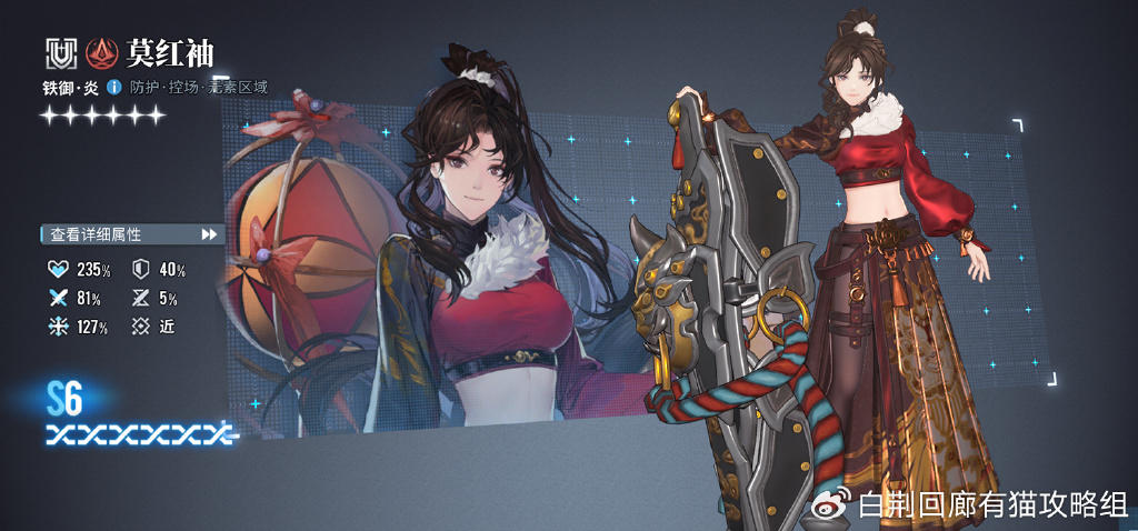 这位舞狮子的大姐姐作为本游戏目前唯一的6星铁御,四测也是迎来了不小的加强,增加伤害的同时大幅增强了自身的减伤技能,相信其承伤能力能给各位监督满满的安全感。这位漂亮姐姐在炎元素地形上能获得大量格挡值,在纯炎队、雷火队都是t位的不二之选。队长技能“祝福区域”需要雾化区域,对于大部分新手来说,触发门槛可能比较高,但其增加的生存能力还是不错的,综合来说想要提升队伍生存能力时,可以作为队长来使用。但是莫红袖在各阵容中并非必须,有其他的替代,开荒期不用着急着去换一个t位。