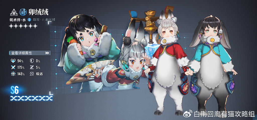 卯绒绒 水属性筑术师兔子作为目前最强的水元素地形提供者,能大范围创造水元素地形的同时还有不俗的远距离输出,虽然宅龙为不少低星角色增加了可施放水元素区域的技能,但在铺展地形的范围和效率上和卯绒绒没法比。队长技能“主场扩大”还是水元素反应队伍的核心技能之一,如果你需要水元素地形来组水霜,水雷等元素反应队伍,卯绒绒就是最佳选择。
