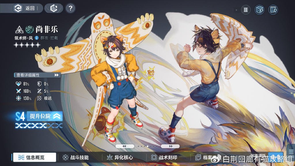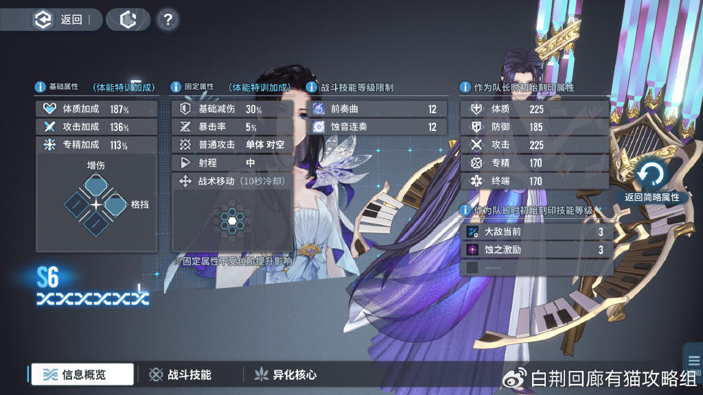 云无月作为新增六星轻卫,拥有着可以灵活切换进攻与防御形态的特性,核心机制是为全体同调者添加「复调」效果,「复调」会在友方同调者普攻时周期性触发,造成额外伤害。尤其是友方同为蚀属性同调者时,「复调」能大大提升蚀爆值积累的效率。云无月6阶时基础属性加成为187%体质、136%攻击、113%专精,作为队长的刻印属性非常平衡,看起来是位能抗能打的六边形战士。