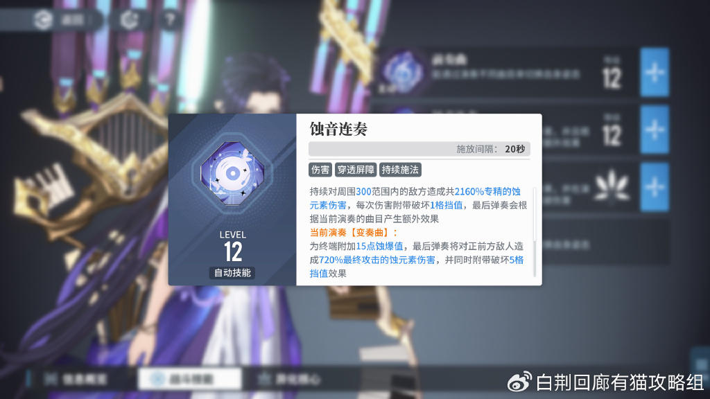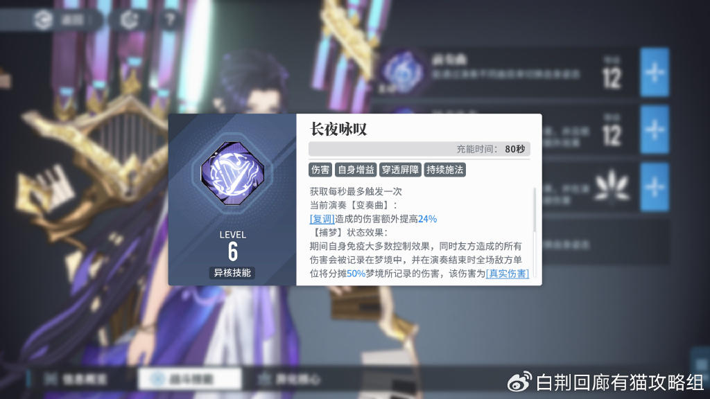 异核技能长夜咏叹,施放后开始持续演奏,期间对随机8名生命较高的敌方单位造成基于专精的蚀元素伤害,并进入【捕梦】状态,提升当前姿态的效果。
