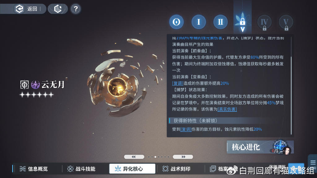 防御姿态下获得当前最大生命值的护盾,代替友方承伤的比例提升到65%,代替承伤时附加的2蚀爆值变为双倍;进攻姿态下「复调」造成的伤害额外提高14%。【捕梦】状态下云无月免疫大多数控制效果,同时记录持续期间友方造成的所有伤害,技能结束时将记录伤害的30%以真实伤害的形式分摊给全场的敌方。这个大招非常给力,并且在施放时机上可以灵活选择,在需要承伤时用防御姿态施放,直接为云无月提供第二条命,还能为友方承受大部分伤害,需要爆发输出时用攻击姿态施放,提升「复调」的伤害,建议配合终端技能同调共鸣使用,尽量在【捕梦】期间打出最高的输出。还有,梦境记录的伤害是分摊至敌方全体的,如果只有一个敌方,不就全都给到它一个单位了嘛,所以我们在boss战施放异核技时,除了留技能buff打出最高输出外,还要尽量解决boss以外的其他单位,让高贵的真伤加在boss一人身上。我们再来看看云大佬大招的核心进化吧。进化提升技能期间造成的伤害、防御姿态提升代替友方承伤的比例,攻击姿态提升「复调」的增伤比例,以及【捕梦】结束后梦境伤害转化成真伤的比例增加,这些没什么好分析的,重点来看一看一核与三核进化带来的新特性。