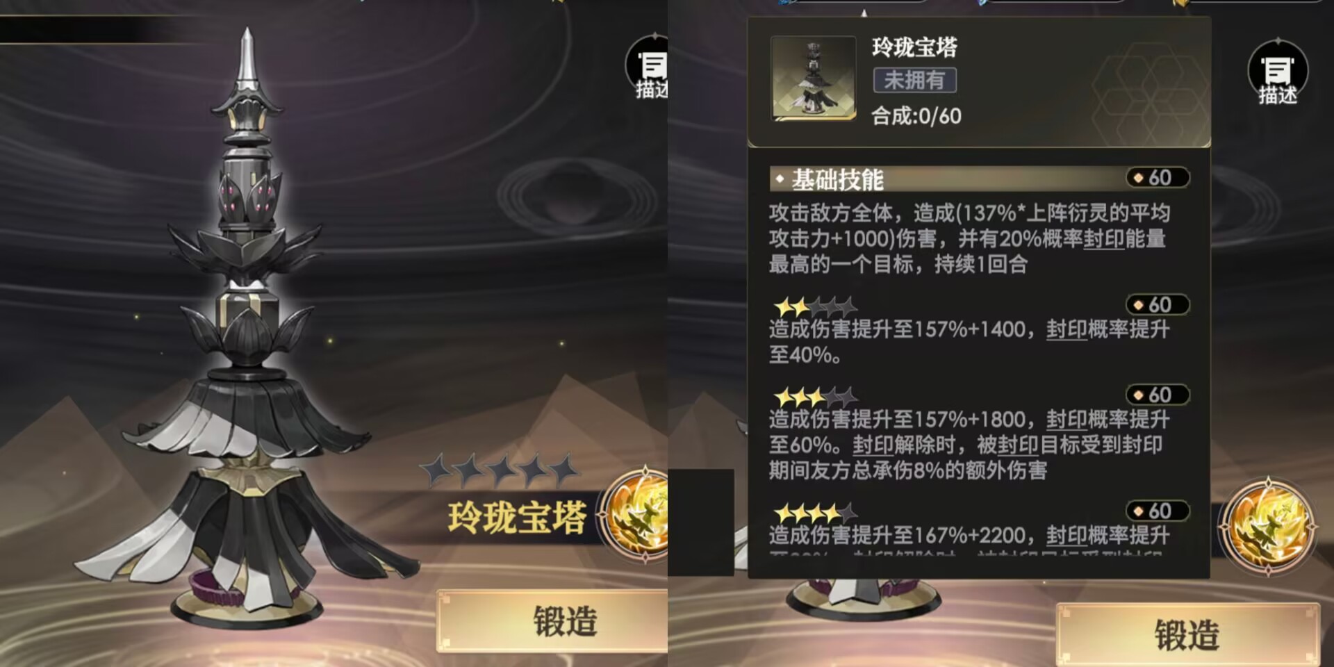 解析:偏向pvp的法宝,pvp必带的法宝之一,全体输出+封印能量效果,比金刚琢好用太多,当然pvp也可以搭配金刚琢形成:封印+缴械。但是金刚琢的缴械机制很看脸。