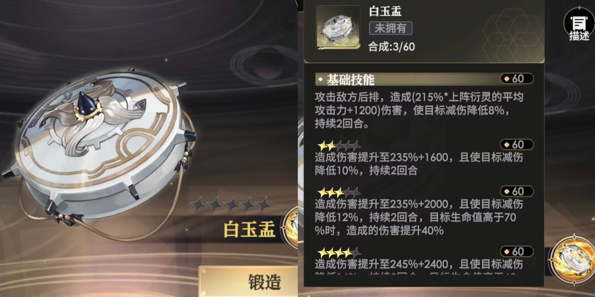 解析:针对后排打击型的法宝,对后排能够造成减伤和高额的打击。适合搭配像李白这种切后型的角色使用,缺点是目标切后流并不强势,切后阵容不完善也导致了这个法宝弱势的原因。不是很推荐大家去培养这个法宝,因为有更好的法宝。