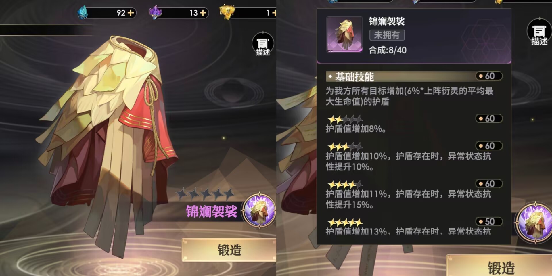 解析:全体护盾加成的法宝,满星后护盾存在可以免疫控制,缺点是护盾值并不算太高,满星后护盾加成是是13%+上阵洐灵的平均生命值。算中规中矩,其实很容易破,特别是遇到高战。比较适合前期中期使用,后期的话没有位置佩戴。