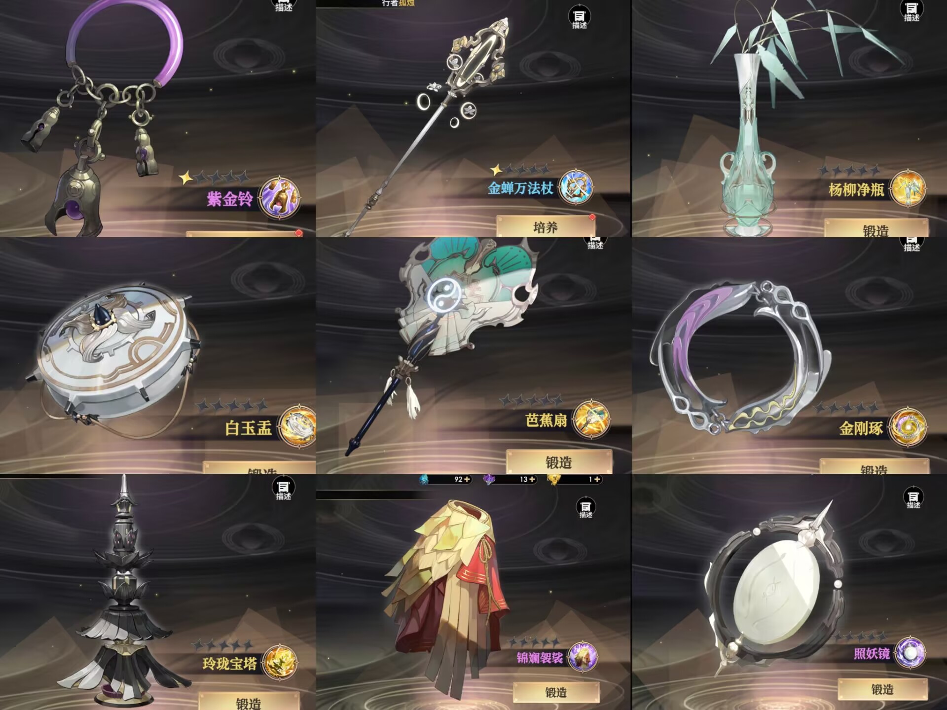 目前一共有9大法宝分别是:紫金玲、金禅万法相、杨柳净瓶、白玉盂、芭蕉扇、金刚琢、玲珑宝塔、锦斓袈裟、照妖镜。