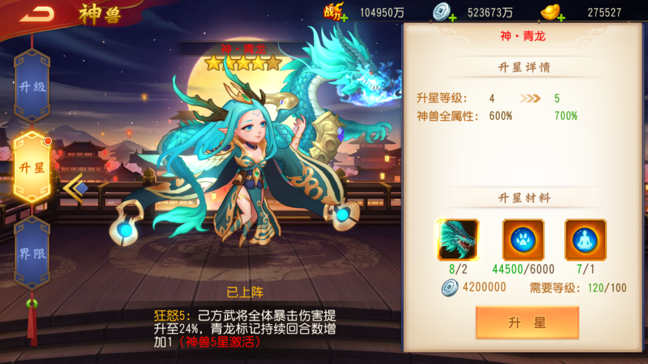 青龙3星就能开启升红了,回怒,暴击buff都增强了,但是没有强出天际。