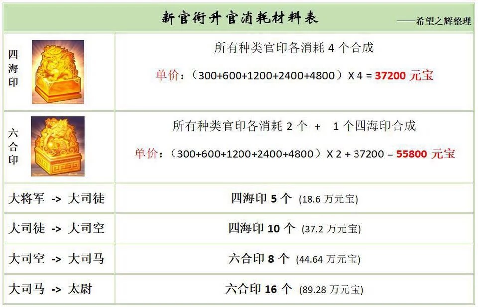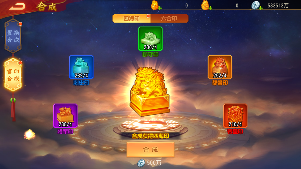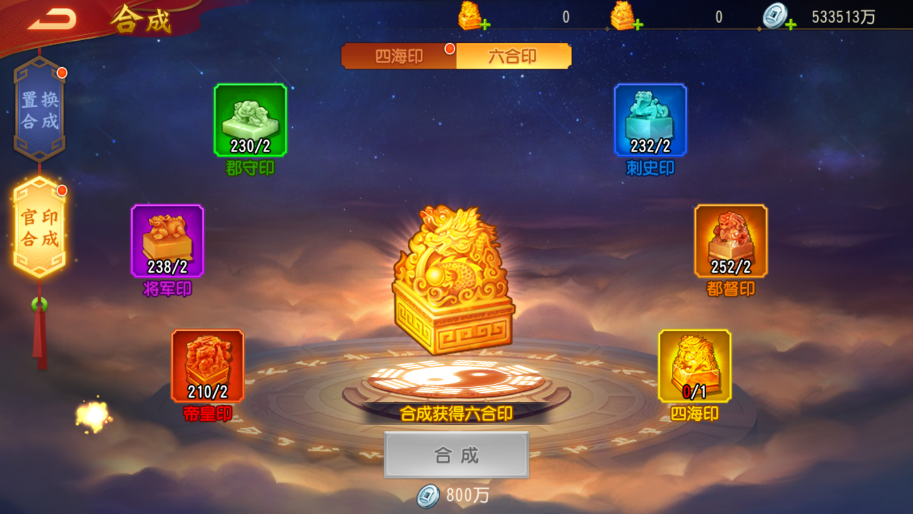 四,新增官职进阶,新增了大司徒大司空大司马太尉,进阶需要四海印,六合印,这两种印需要用其它的低阶官印进行合成