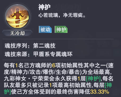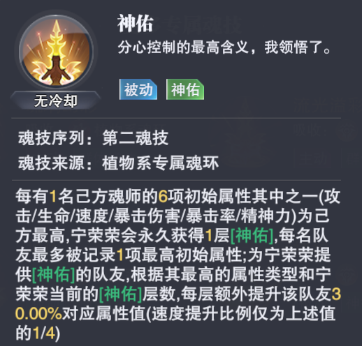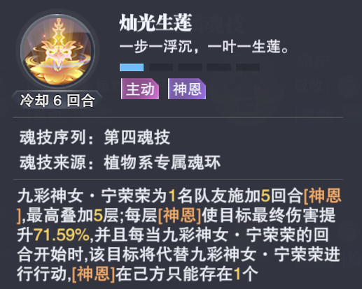 另外在PVE中除了“神佑体系”的给予,【神恩】这个buff效果也是非常强力,不仅为主C提供了超强的增伤辅助,同时还有更多的出手保障,不管是任何打法【神恩】都是无可挑剔的存在,因此经由“神佑”+“神恩”双效果的加持,SP宁荣荣就是目前PVE中最强的防辅系魂师,或者你说是最强的魂师都没啥问题。