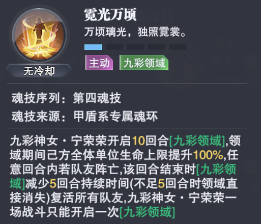 然后SP宁荣荣在PVP中的【九彩领域】也是颇为恶心,打破竞技场胜利规则的设定直接就让它成为了当前版本中第一领域的最有利竞争者,其重要性综合来讲应该和“神护体系”不相上下,因此经由“神护”+“九彩领域”双效果的加持,SP宁荣荣就是目前PVP中最强的防辅系魂师,或者你说是最强的魂师都没啥问题。