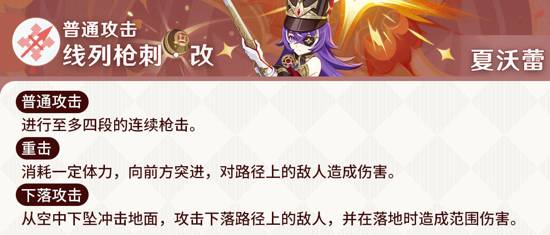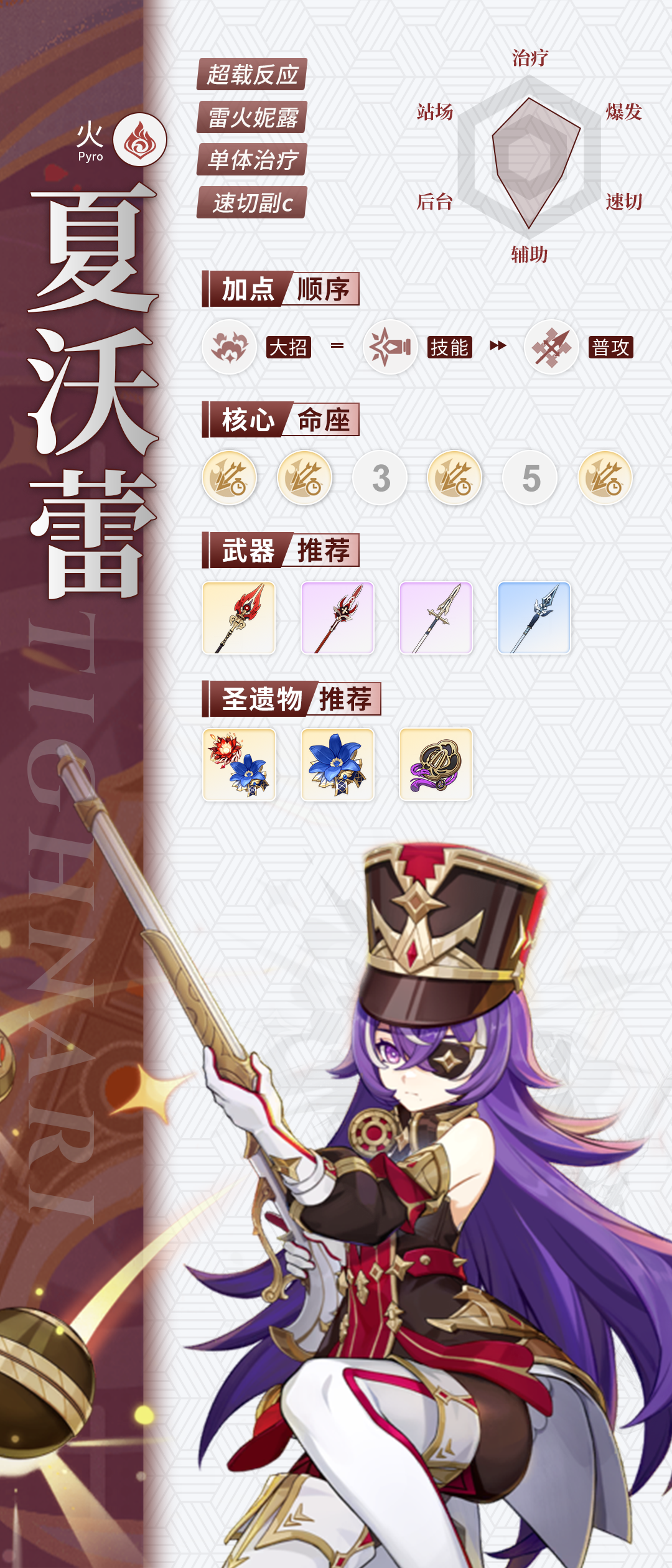 夏沃蕾是一名火元素长柄武器角色,拥有荒性始基力,定位为速切辅助,辅助好队友的同时自身具备可观的输出能力。