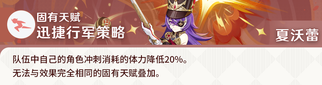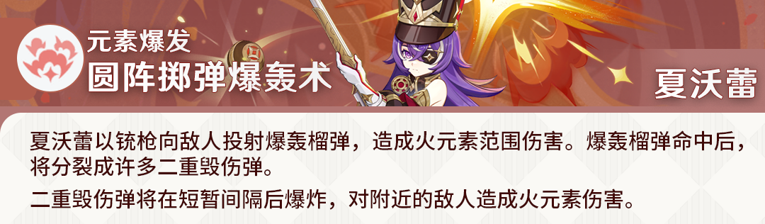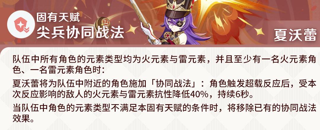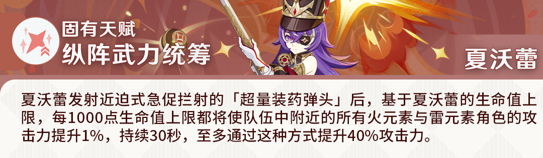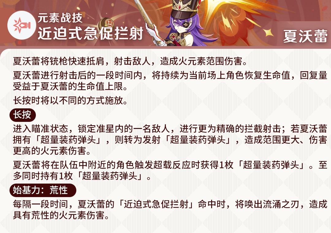 夏沃蕾的核心天赋是她的元素战技[近迫式急促拦射]与固有天赋[尖兵协同战法],她的辅助能力是围绕这两个天赋进行运作的。