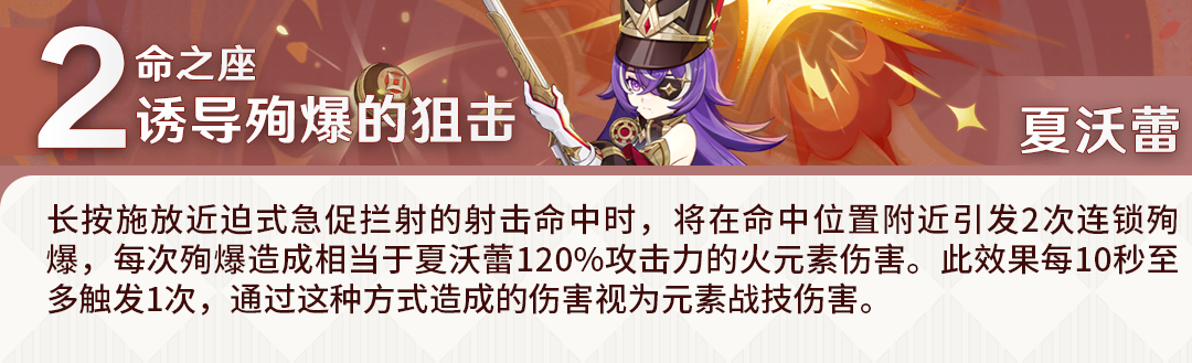 解析:乍一看只是240%的伤害倍率提升,聊胜于无,实则这[连锁殉爆]大有玄坤。这是和元素爆发中的二重毁伤弹同款的效果,可以使敌人向夏沃蕾击飞,提升队伍的聚怪作战能力。