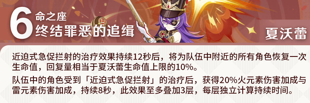 夏沃蕾的六命还赋予了元素战技群奶的能力,后台的角色被奶到后也可获得一层雷火伤害加成buff。
