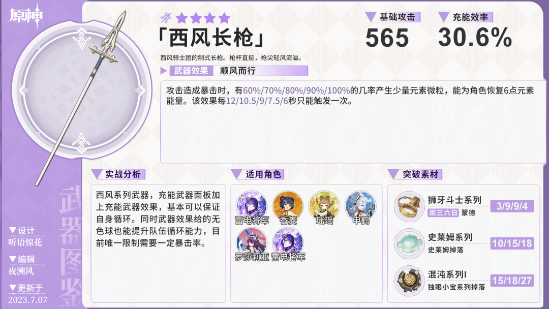 解析:在队伍角色满足[协同战法]时为场上的角色提供能量回复,每10秒回6点,散装西风枪,优质回能命座。
