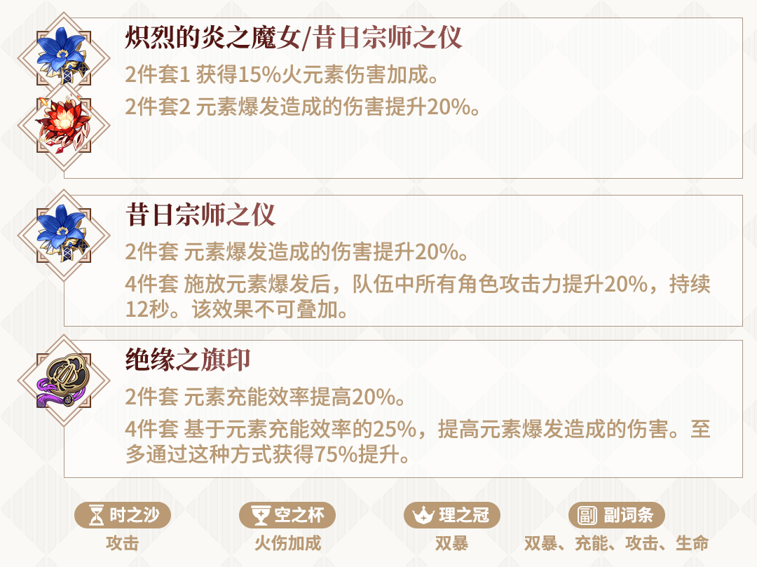 主词条上,推荐旅行者选择,攻击沙,火伤杯,暴伤/暴率头。