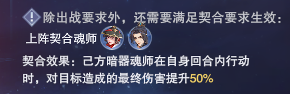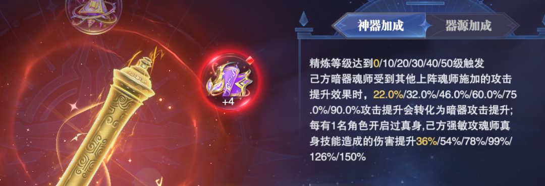 首先新神器的基础效果为让“暗器魂师”能够享受到友方的攻击力加成,这点在SP千道流等增伤魂师身上会更显效果,同时还会按照己方开真身的数量来提升“强敏攻魂师的真身技能伤害”,大家注意这里只会提升真身技能的伤害,所以从这个加成规则来讲,目前也就SP尘心会相对比较适合。