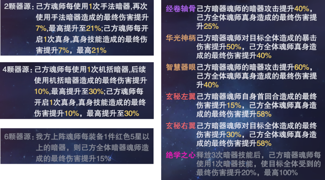 接着是神器的套装效果和不同器源的效果,这里大家注意2/4套装的效果是同时兼具暗器和真身增伤的,但是6套装就只有暗器增伤了;此外在器源效果中,绝学之心不包含真身的增伤,其余则都包含真身的增伤效果,大家参考一下。