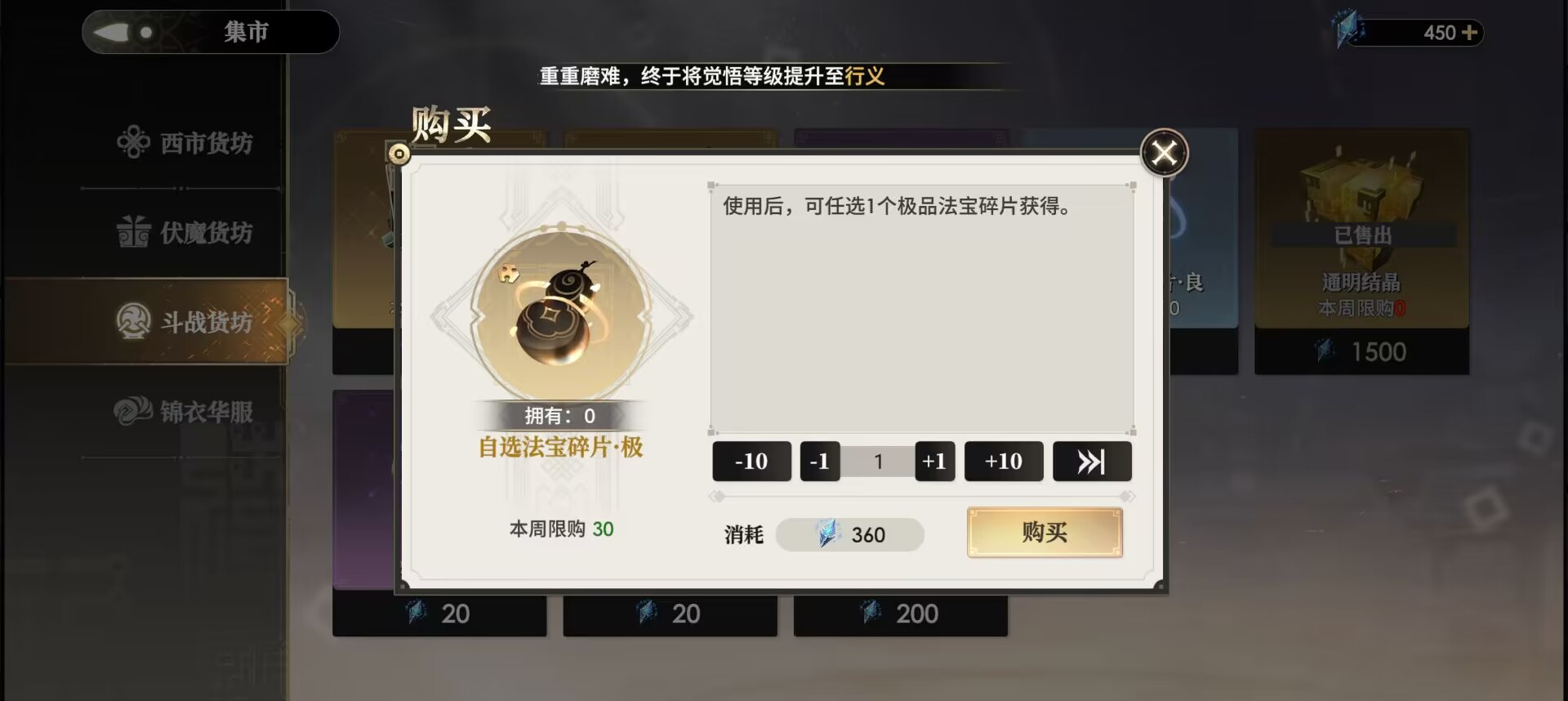 橙品法宝获取难度非常大,目前橙品法宝除了氪金以外,获取主要途径就是通过商店来兑换碎片进行合成。