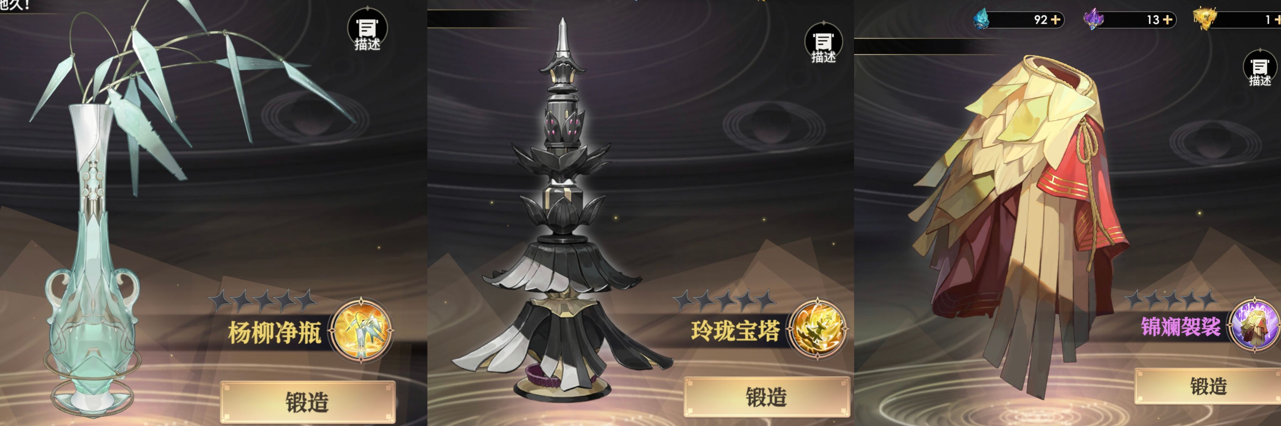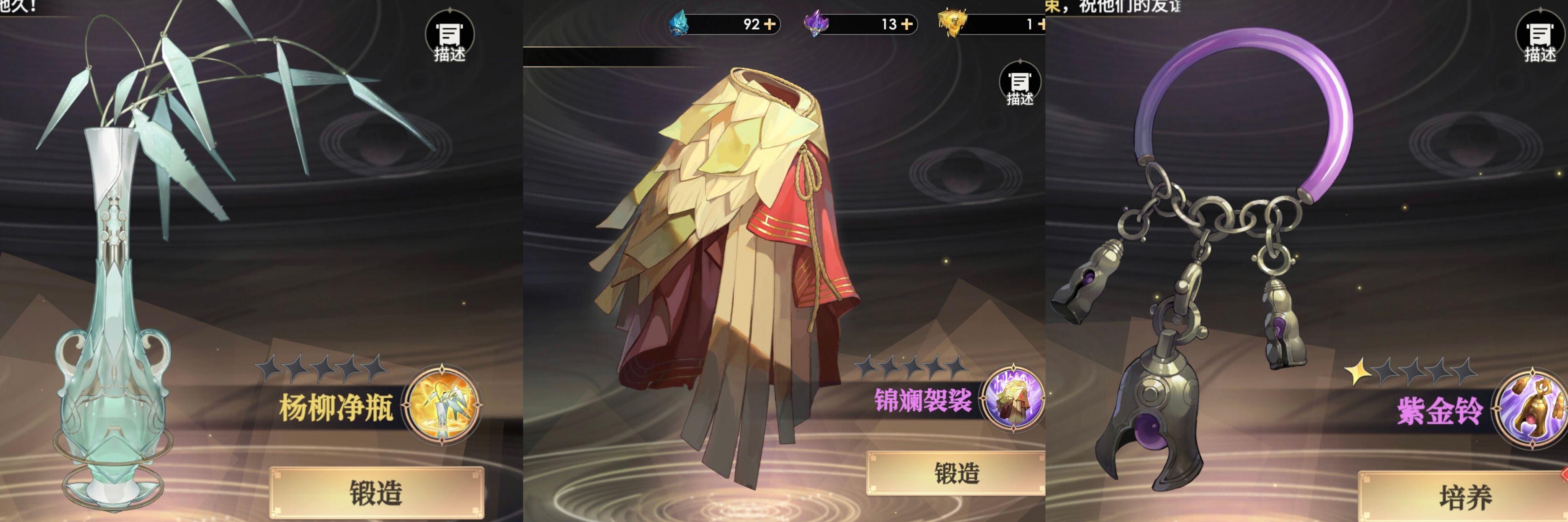 前期搭配:杨柳净瓶+锦斓袈裟+紫金铃。解析:主升杨柳净瓶和锦斓袈裟。