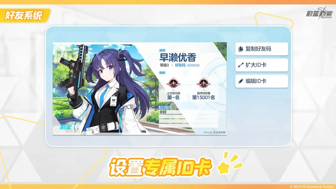 首先,老师可以通过新的【ID卡】来定制自己的信息内容。在您的ID卡上,将会展示等级、好友码、总力战及战术对抗赛成绩,以及代表学员,老师可以自由定制自己的ID卡决定希望展示出来的信息哦。编辑您的ID卡,可以让其他人更加了解您,也别忘记在自我介绍里与大家打声招呼~