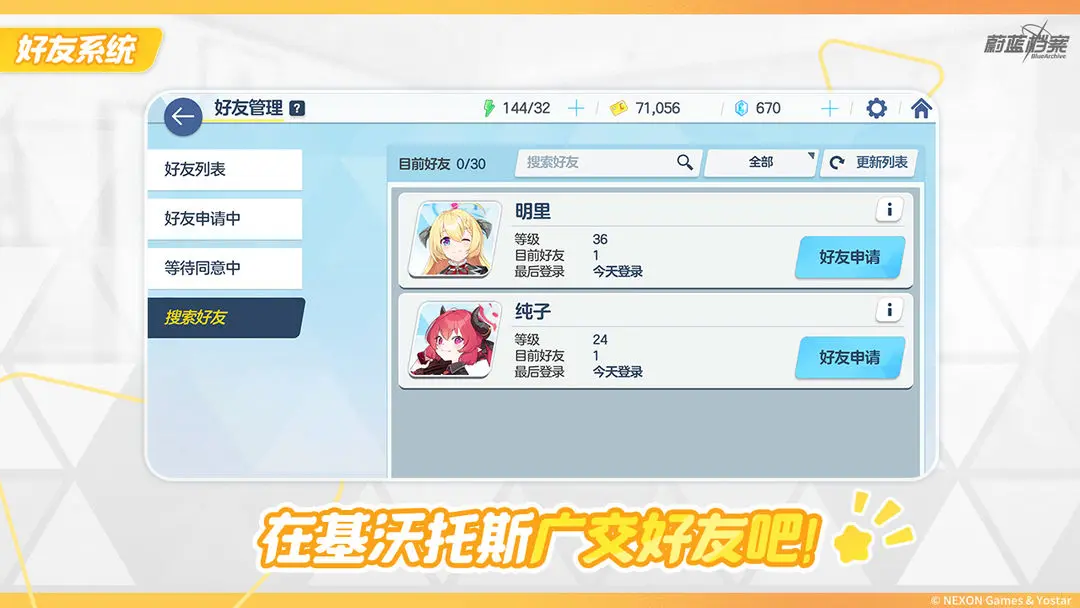 01月18日维护更新后,什亭之箱将迎来一次重要升级。包含大量游戏内容新增及优化更新。其中主菜单将新增【好友】功能入口,您可以快速管理自己的当前【好友列表】与【ID卡】信息,在基沃托斯广交好友,可是有许多好处的哦!让阿洛娜来具体说明一下吧!