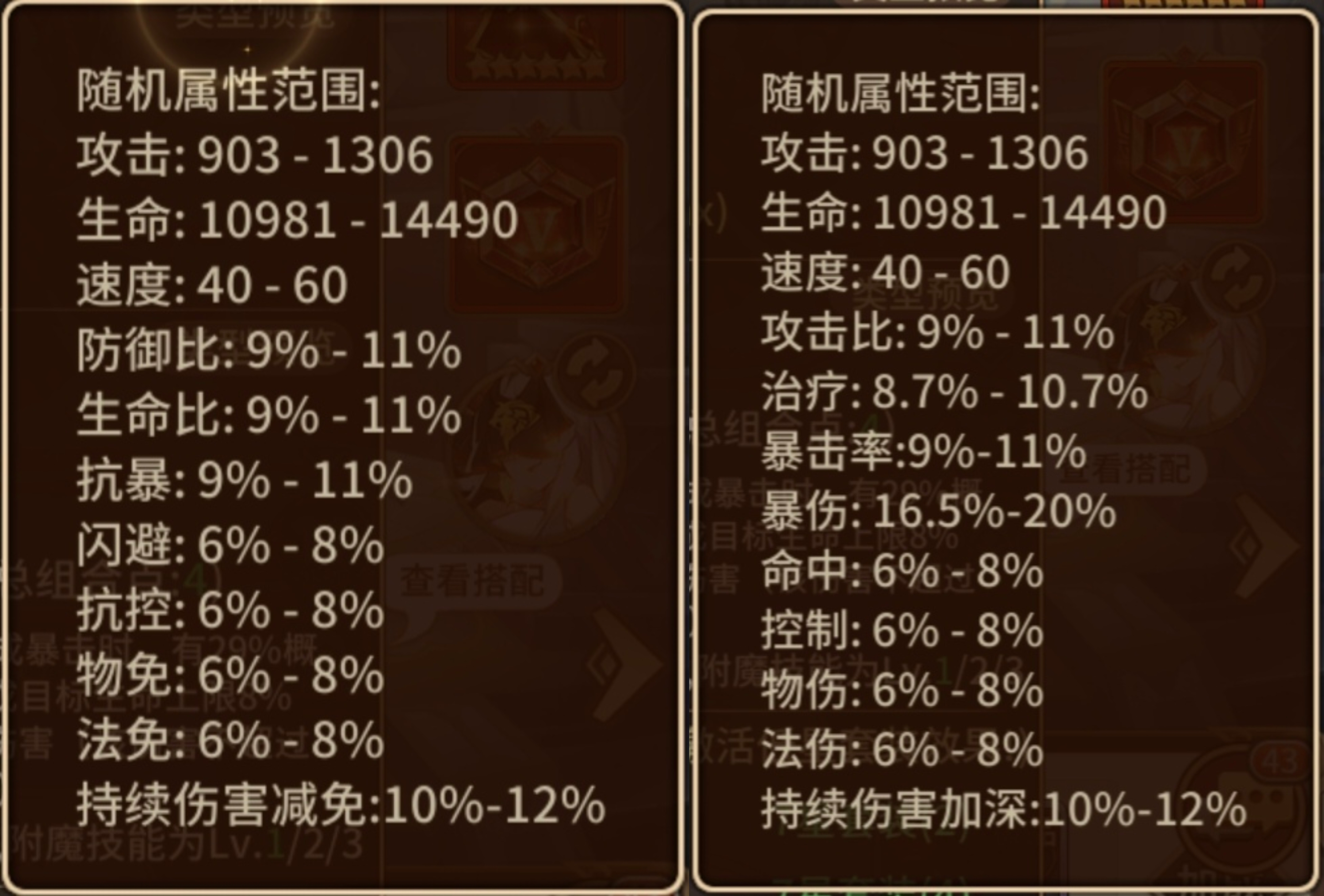 左边神装:左边的词条适合的坦克比较少,大多数玩家都是随便带,这里有两个英雄,主要是盘古和佳瑶,佳瑶可以考虑携带下面的,磨盘古一般是需要卷速度,所以我个人推荐是物伤、暴击、速度,加百利这种功能坦就洗命中和速度,剩余的一个也比较随意。