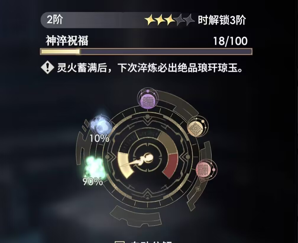 ②第二个问题:粹炼祝福和粹炼灵火是什么意思?灵火就是:粹炼的温度,每个天柱粹炼的时候都有5个温度。温度越高出现高品质的琼玉几率就越大。