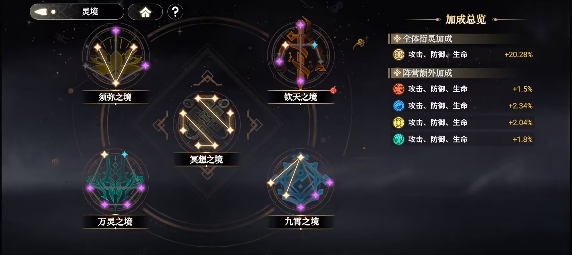 灵境一共有五大加成:分为1个全体加成和4个阵营加成。