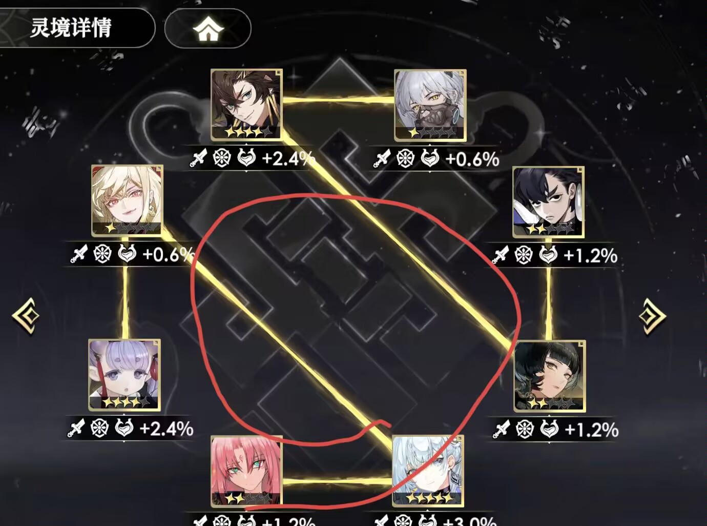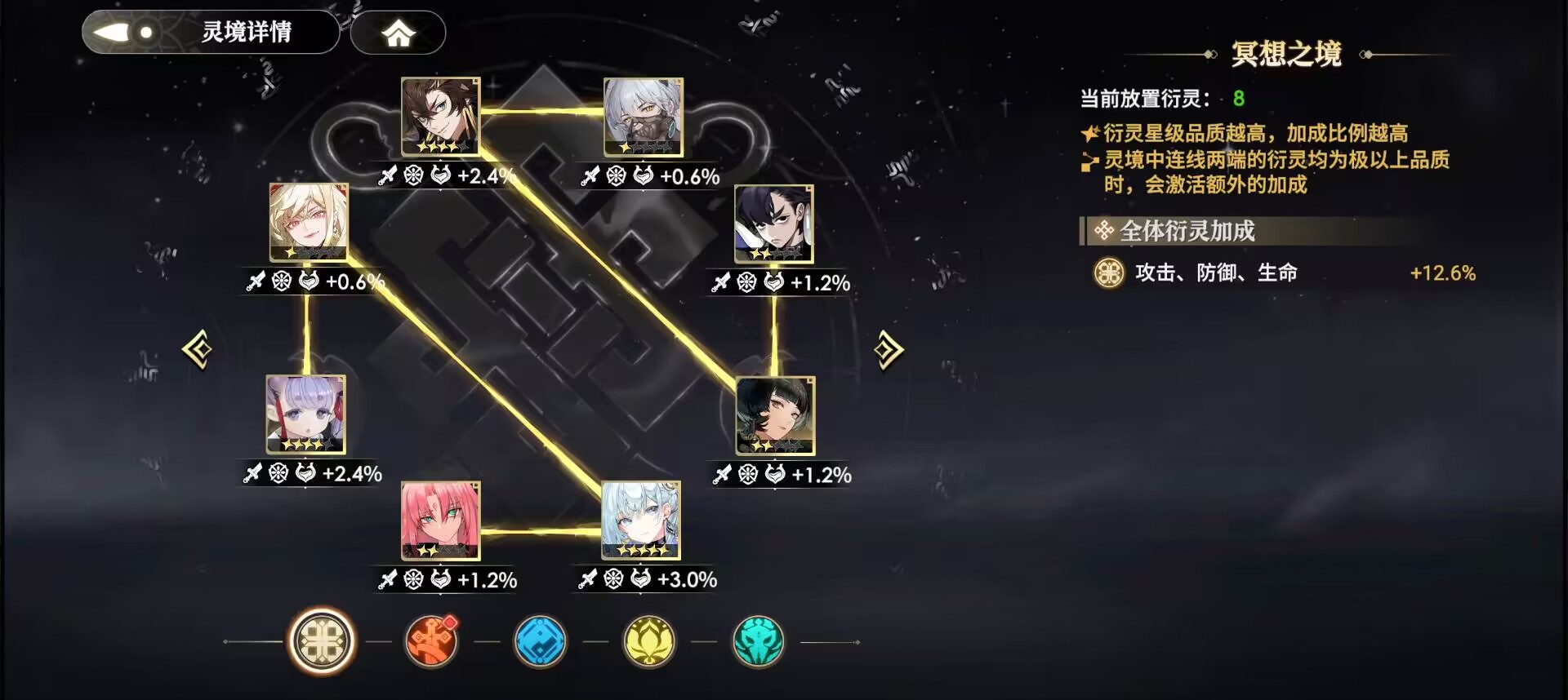⭐然后这里有个细节要注意:灵境连线两端一定要优先派橙品洐灵,这样可以激活额外属性加成。