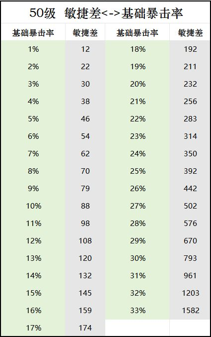 默认参考暴击率对应的是敌方敏捷为0时候的暴击率,50级的时候,得到如下表格: