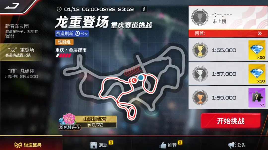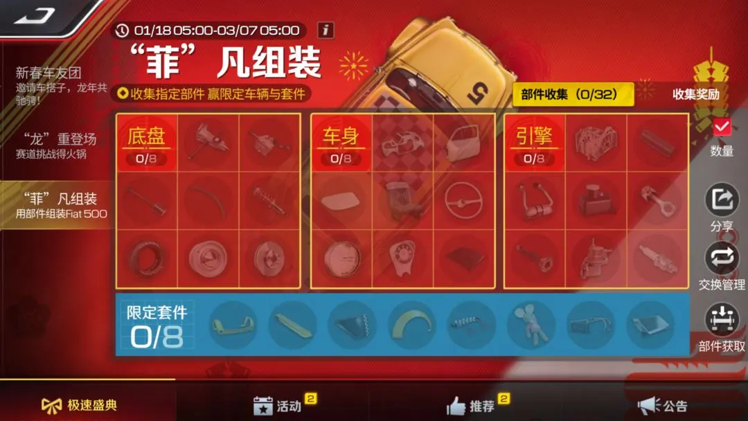 1月18日起,每日完成指定任务即可获取部件,与车友交换部件,协力造新车!集齐底盘、车身、发动机所有部件后可免费领取【运动组】限定传奇车辆——Fiat 500F '65!集齐全部限定套件还可免费获得Fiat 500F '65限定套件。此外收集部件还有额外奖励,海量钻石等你来兑换!免费领新车,欢聚过新春!