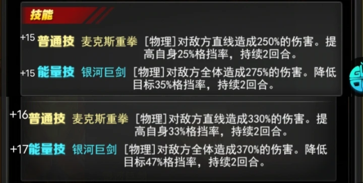 +17能量技 银河巨剑[物理]对敌方全体造成370%的伤害。降低目标47%格挡率,持续2回合。