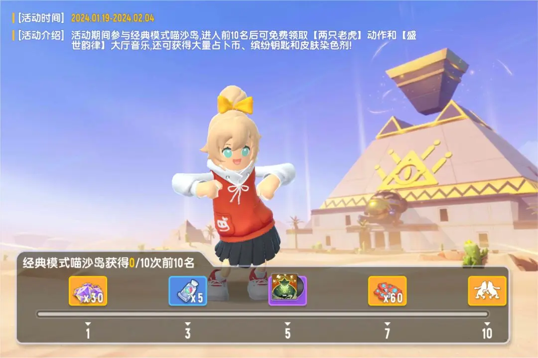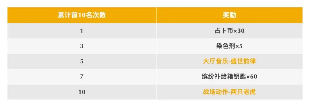 只要参与经典模式喵沙岛,累计进入前10名达到指定次数就可以免费领取【两只老虎】战场动作和【盛世韵律】大厅音乐,还可以获得占卜币、缤纷补给箱钥匙和皮肤染色剂等奖励~