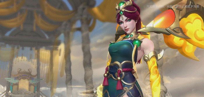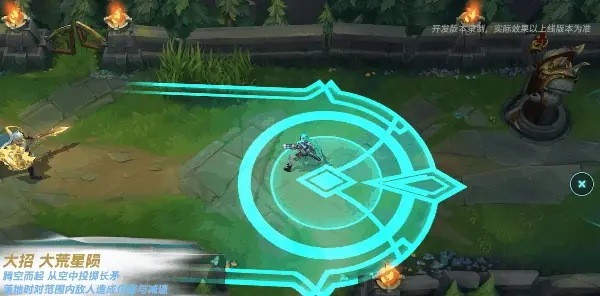 激发力量的潘森蓄力并展翅跃至空中,长枪如流星陨落产生炫目的拖尾光效。潘森落地时形成半圆形的金色冲击波,对范围内敌人造成伤害与减速,冲向敌人的周围还会出现大范围的祥云标志的路径。