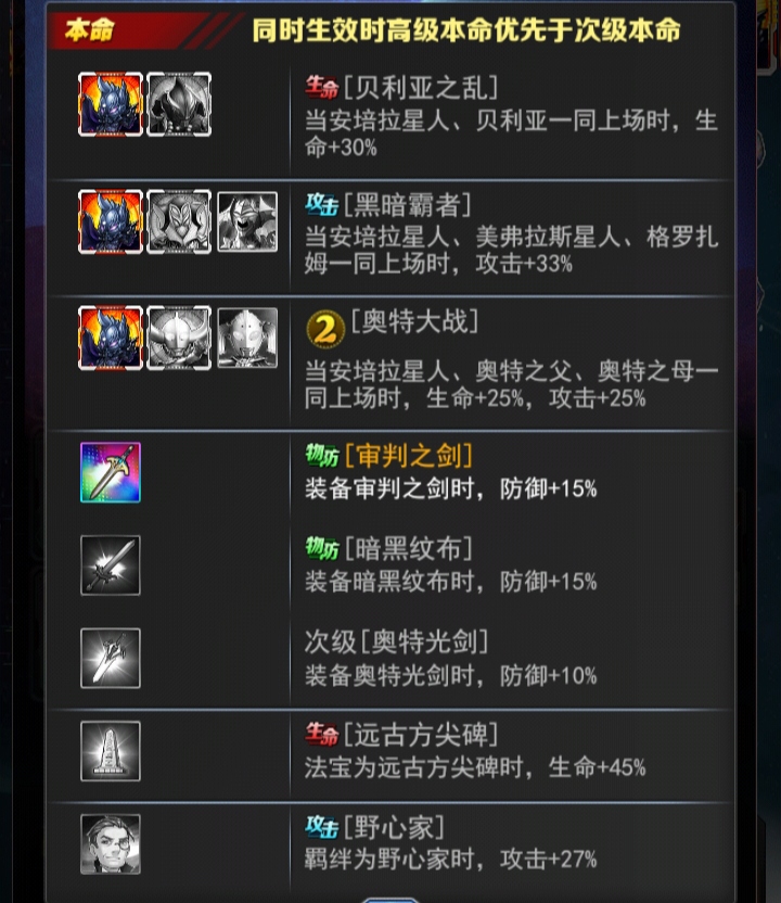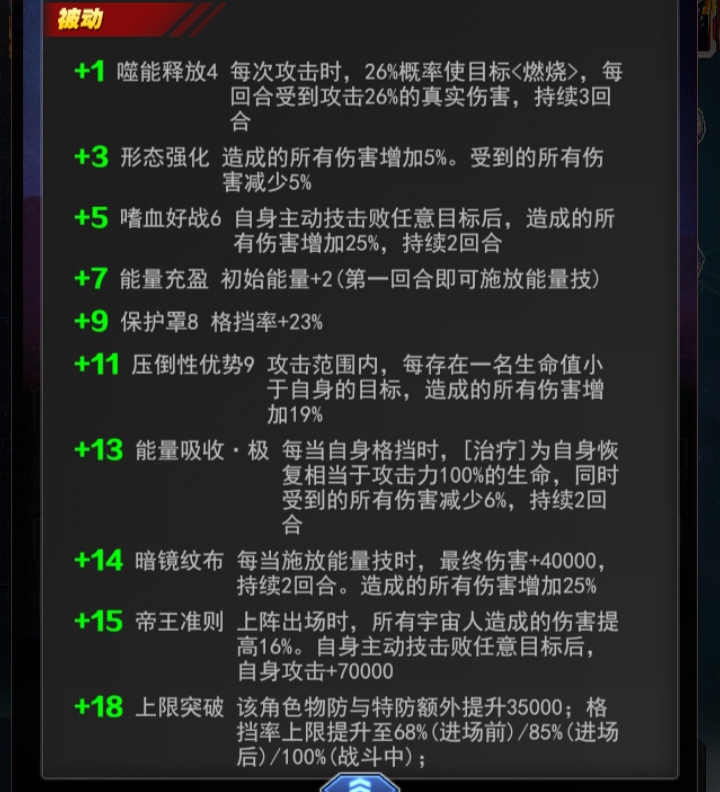 +15 帝王准则上阵出场时,所有宇宙人造成的伤害提高16%。自身主动技击败任意目标后,